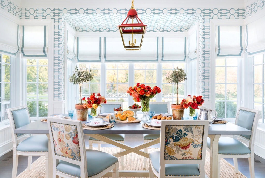 1 – I’ve been searching for the perfect wallpaper for our future powder bath, and I really feel like it’s a space we can go rather bold. I absolutely love this bold selection in this Darien, CT dining room from Ashley Whittaker Design. There are several other bold wallpaper choices throughout, but this combo really speaks to me! I love that the fairly basic color scheme in the wallpaper can really be brought to life with the right textile and lighting selections!