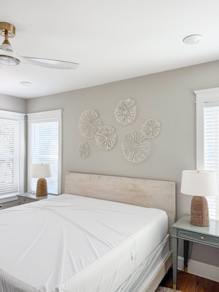 SOURCES: Upholstered Bed | Nightstands | Lamps (similar here) | Euro Shams | Brushstroke Pillow Covers | Rug | Seagrass Stools | Paper Mache Coral Art | Bobbin Mirror | Ceiling Fan