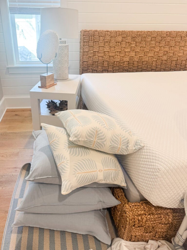 SOURCES: Woven Bed Frame | Nightstand | Palm Pillow Cover | Solid Pillow Cover | Striped Rug | Lamps & Shell Decor: HomeGoods & BeCasa