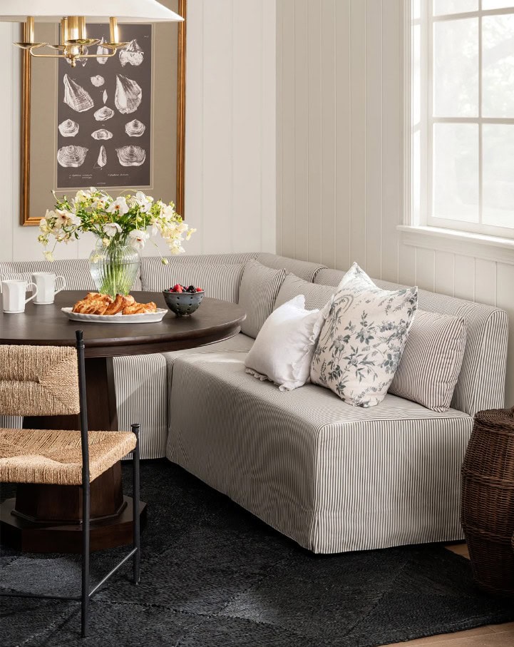 4 – This image was featured in a recent McGee & Co. email ad I received and it stopped me in my scroll immediately. It looks so much like some of the 3D renderings I’ve been making for our future carriage house dining nook! The overall vibe is a bit more cottage-y here, but I’m hyperfocused on having a banquette (you can read more about that here) and our layout would be almost identical to what you see below! When it warms up a bit here, I need to go over and tape everything out on the floor to ensure it will truly all work but I’m pretty set on it! You can find the McGee and Co. banquette pieces here. I’ve also been looking at this option that can be customized in a number of ways. I already have a bunch of samples in hand to test out!
