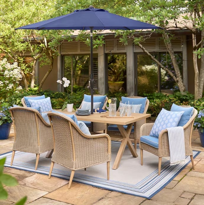 4 – Why is nobody talking about Lowe’s current patio furniture selection? I feel like I need to dedicate a whole different post to this topic alone. Ha! I was shopping for plants there prior to listing our house and ran inside to check the tropicals. So many of their patio furniture pieces caught my eye in the best way! At the time I wasn’t 100% sure we’d sell our house furnished, but now that we know we are, and we are going to need a lot of new pieces, their patio furniture is on my radar! I’m strongly considering this dining set for the new screened-in porch/catio. The full set is less than the price of just a table I was previously looking at :/ ! The contrasting piping cushions give major designer vibes, and I’m also loving these outdoor pillows to pair with it! This scalloped umbrella and conversation set are also worth checking out.