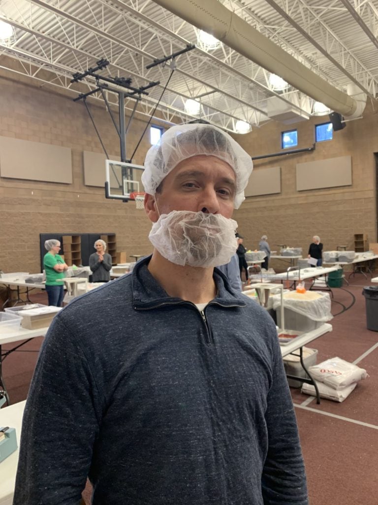 Wednesday nights are when we teach confirmation at church. However this past week, it was a service event in lieu of typical class. We packaged meals for Kids Against Hunger for our third year in a row. It always amazing me that in under an hour, the group of kids and adults package more than 30,000 meals! Here’s Kurtis’ look this year. They add the beard net as a new requirement this year. He loved it 😉