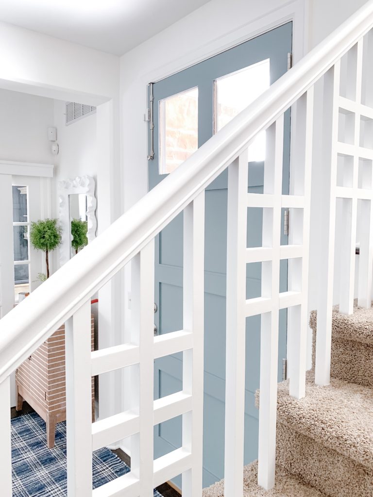 And, I finished the paint on the front door! I have a bit more work to do, but I’ll share the new look very soon! I’m loving how it’s coming together! Such an easy and impactful makeover for about $20 in supplies! I ended up going with Benjamin Moore Water’s Edge and it’s the perfect muddy blue-gray-green I was looking for!