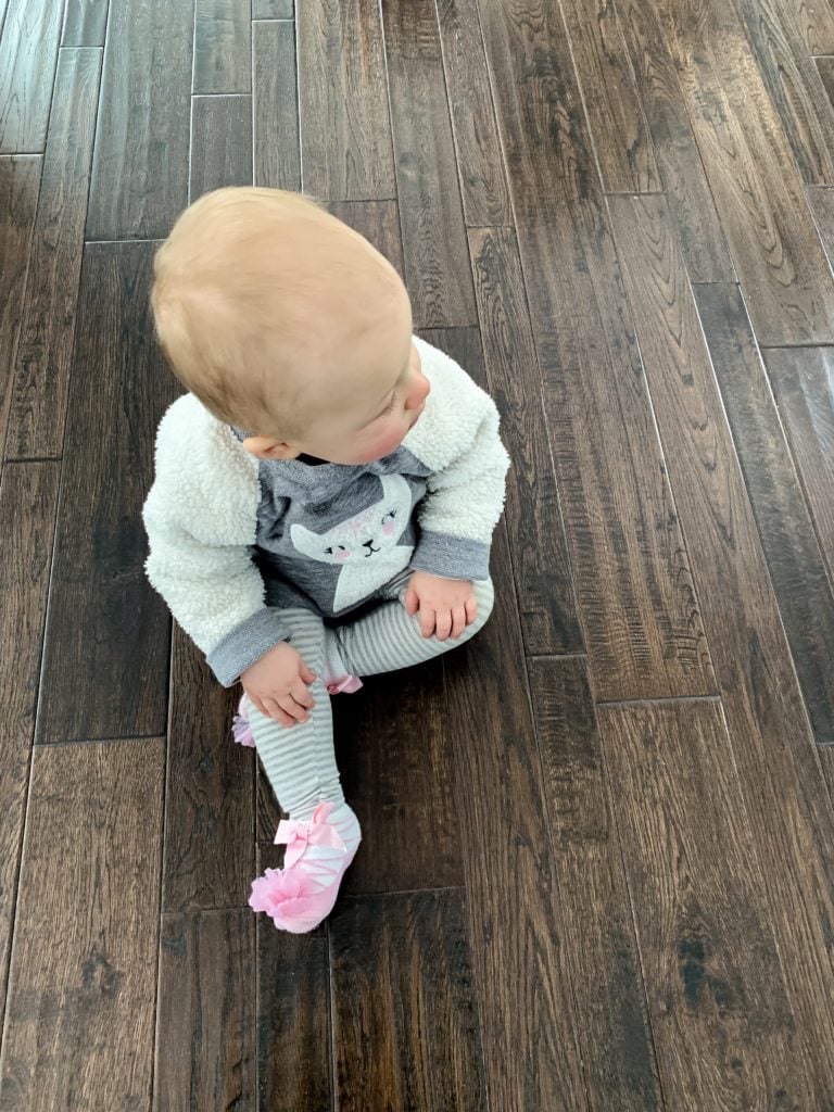 Sunday we had a visit from miss Zoe (and her parents, obviously). Zoe was having a blast exploring some new digs, and I think she thought of our long entryway hallway as her own personal runway. She hadn’t been to our house since summer because we usually go down to their house now for convenience. So, she was also a bit intrigued by the cats (only Hawkeye came out to see her). I loved her little cat top and faux ballet slipper socks!