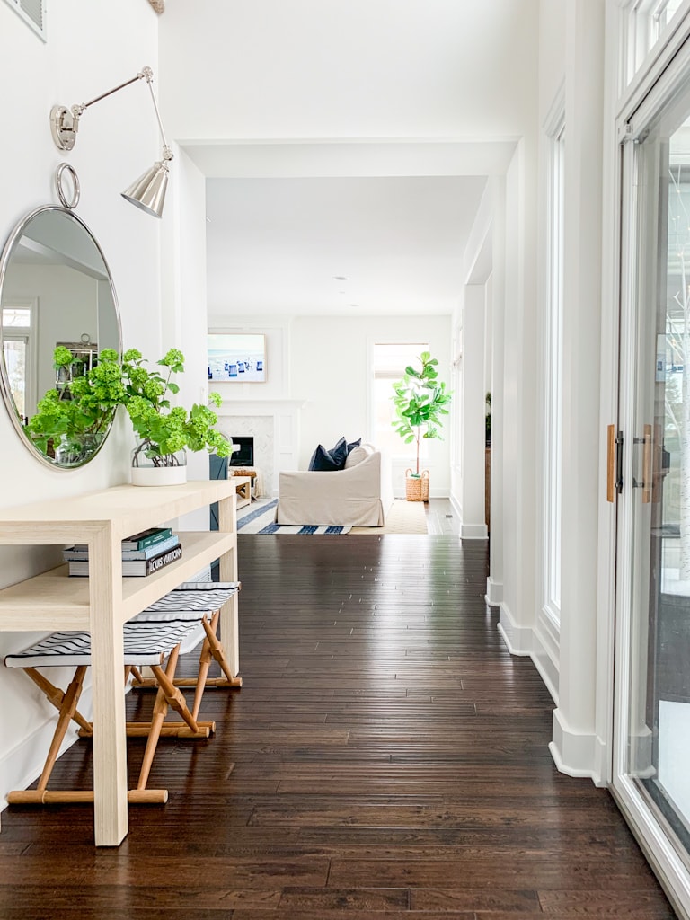 ENTRYWAY SOURCES: Console Table | Stools | Similar Mirror | Dipped Vase | Faux Viburnum Stems | Striped Rug | Linen Sofa | Faux Fiddle Leaf Fig Tree | Woven Basket | Linen Pillows