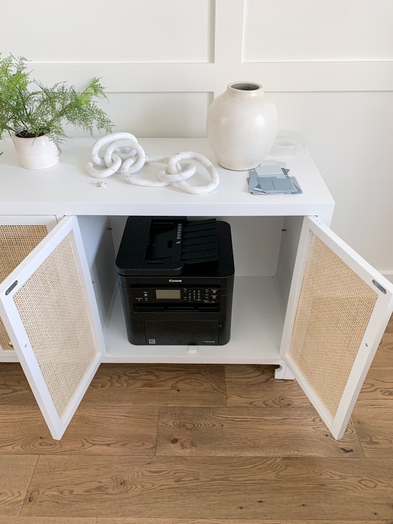 OFFICE SOURCES: Cane Cabinet | Faux Fern | Marble Chain | White Ceramic Vase