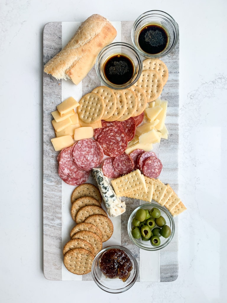 Sunday night it was so hot we didn’t feel like cooking inside or grilling outside. So we whipped up our first charcuterie board of the season and it was so good! I’ve said this before, but I’d be okay with eating this for dinner every night! Either that or caprese salads! I used this striped marble board to serve everything on.