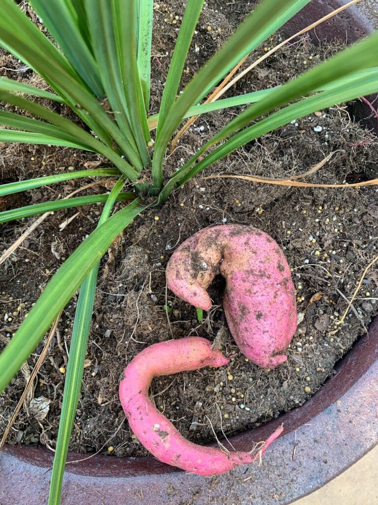 I dug up a few of my planters last week, and it’s always fun/interesting to see what type of sweet potatoes I managed to harvest off my sweet potato vines. This year’s looked a little strange! I still need to dig up all the ones in the backyard planters.