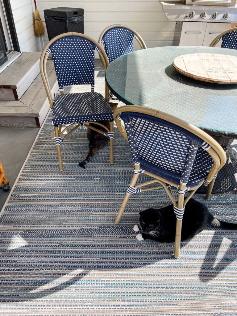 PATIO SOURCES: Outdoor Rug | Woven Garbage Can | Round Table | Similar Chairs
