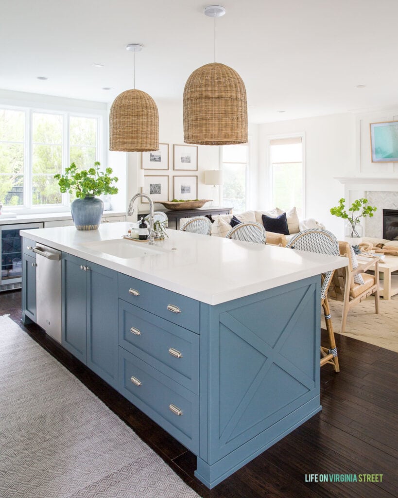 SOURCES: Indoor/Outdoor Runner Rug | Basket Pendant Lights | Counter Stools | Vase | Faux Viburnum Stems | Cabinet Pulls & Knobs | Gallery Wall Frames (look for less here) | Wood Dough Bowl | Lamps | Linen Sofas | Leather Chairs | Raffia Coffee Table
