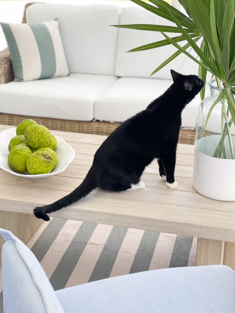The remainder of any furniture I’ve ordered so far has finally been delivered as of last week! Which means I feel like the house is put together enough to share a mini tour with you. I have the post ready to go tomorrow, so I hope you’ll check it out! I used a lot of fresh palm fronds (that some landscapers had just clipped while doing cleanup) and Hawkeye was a big fan 😉