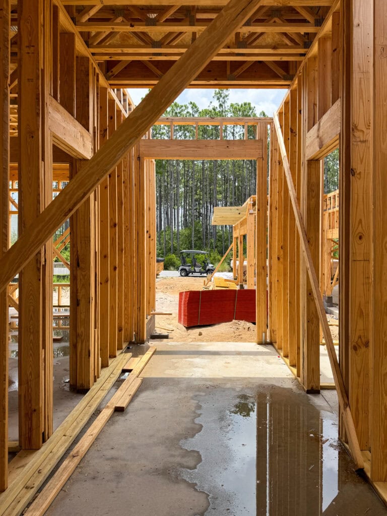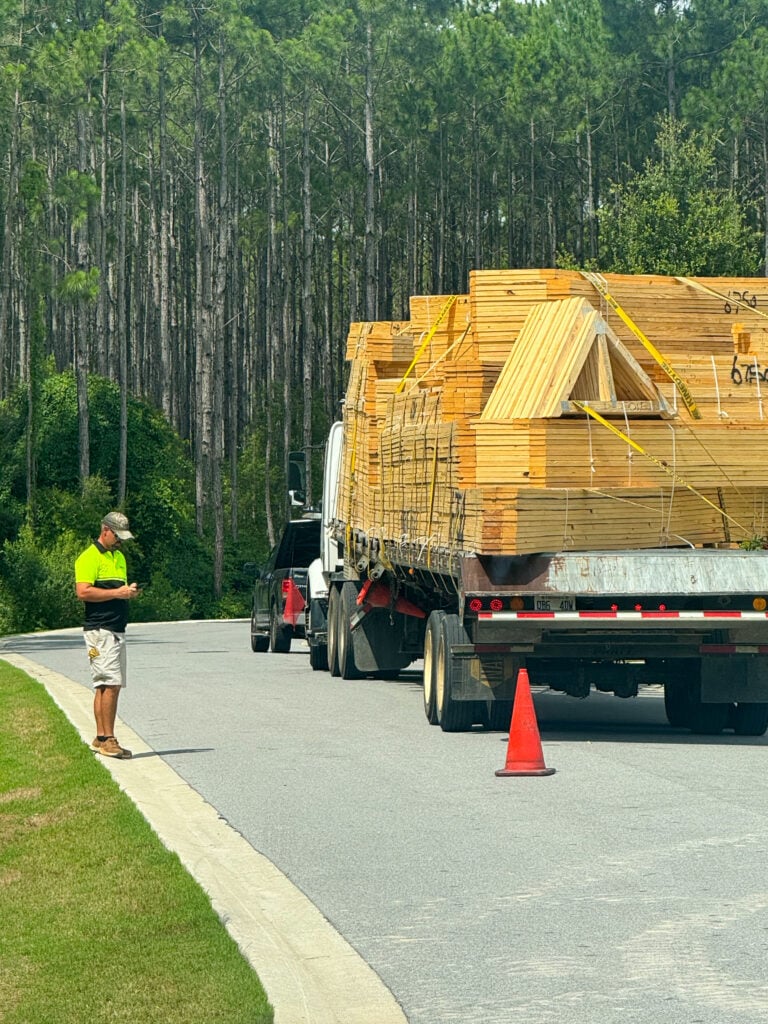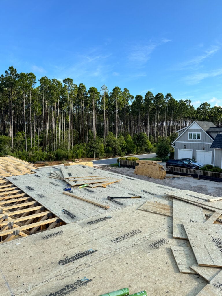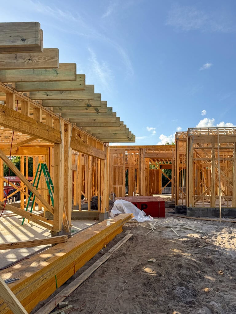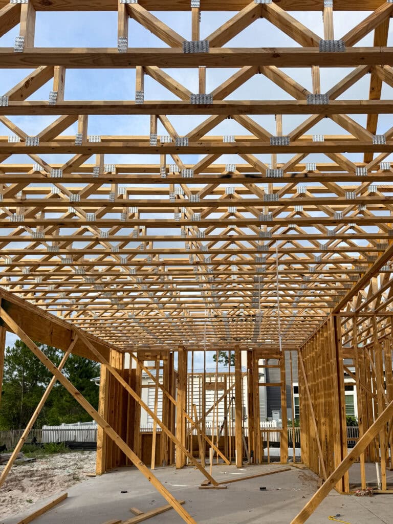 Although we didn’t get walls on the second story at the new build, we did get floor trusses for the second story/first floor ceiling! It already looks so different on site!