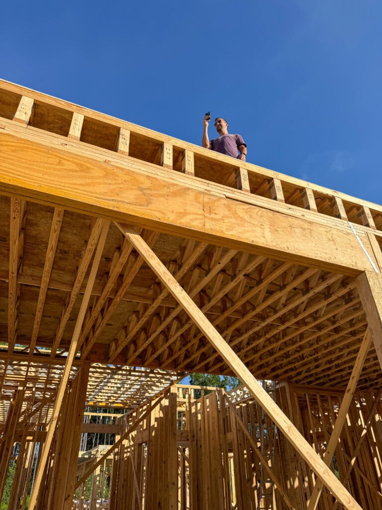 Once they added the plywood to the “floors” upstairs, Kurtis hiked up the ladder while I stayed on solid ground. He FaceTimed me the view from his new office. It all looks so different now and we’re excited to see how it progresses over the next week or so.
