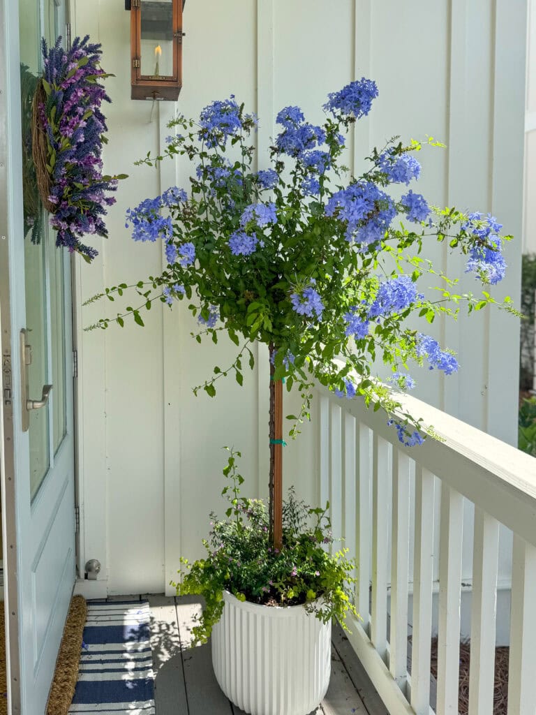 The blue flowers on my front porch topiary came back with a vengeance this past week! The blooms had previously all fallen off, but I’m happy to report it looks like it will keep generating them for the summer! I may actually have to trim it all back at some point because it’s starting to grow a bit unruly! I actually just looked back at this post and am laughing now at how crazy it has gotten. Definitely time for a haircut!