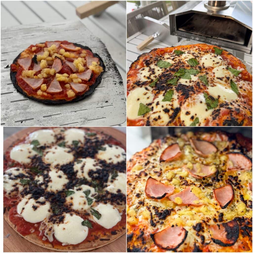 Yesterday, we tried all new pizza crusts. We’ve also quickly learned that pre-shredded cheese basically ignites and chars immediately so we need to pre-shred our own. The fresh mozzarella slices work so well! We also realized the ultra thin crusts burn too quickly (shown in the top left below).