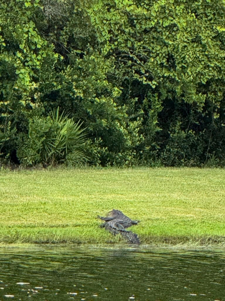 Kurtis then spotted the tiniest little lizard on our garage door (I thought it was grass from the mowers)! And later that evening, I spotted a gator on the bank of a pond in our neighborhood!