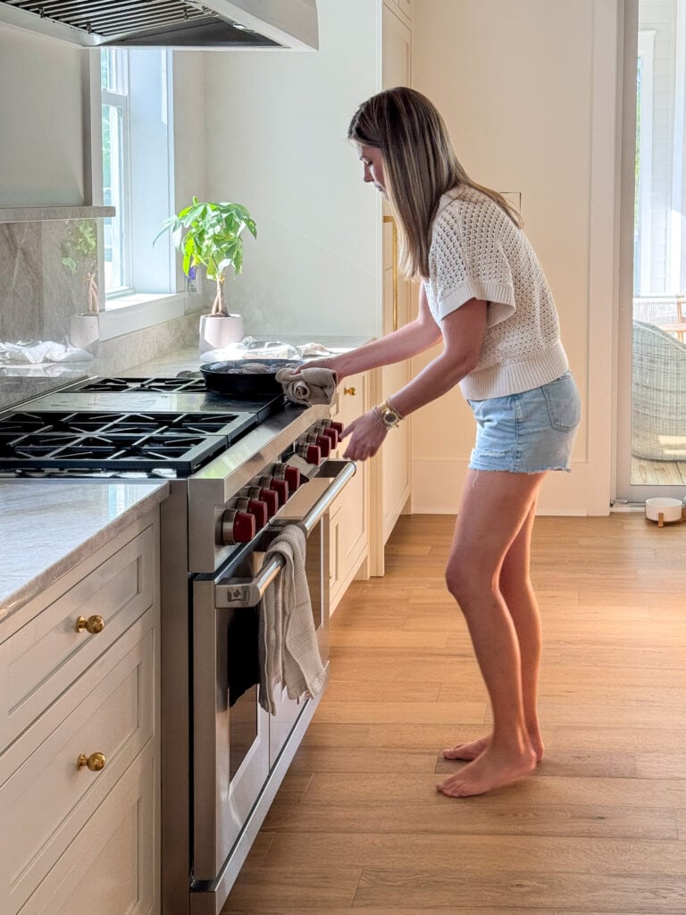 Rachel makes one of our all-time favorite steaks. I had been trying to get my hands on her exact cast iron skillet and it finally came in stock a month or so back. So, we picked a week last night and she taught me how she makes them. She essentially seasons them with only black pepper and garlic salt. She then sears them on each side and then bakes in the oven. So, so yummy!