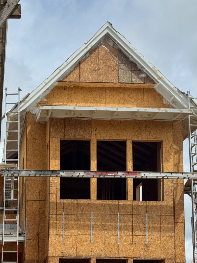 On the exterior, they got all of the eaves and rooflines primed! They’ve already started doing a lot of wood filling, as well. It was so great to finally see a color other than the orange plywood and OSB all over the house!