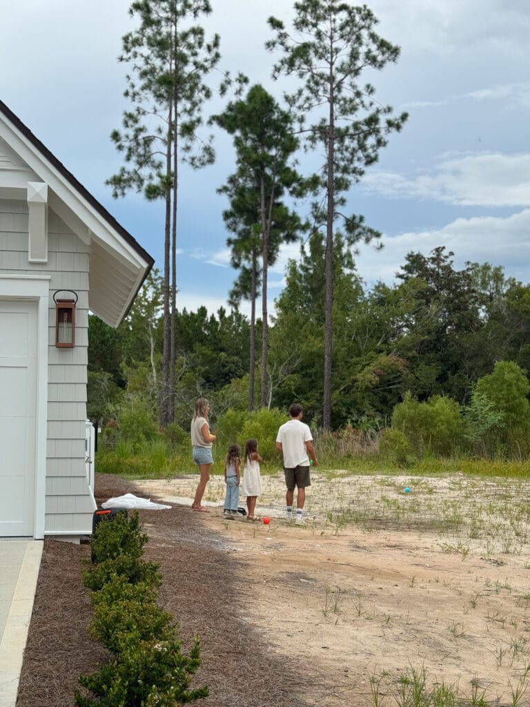 Here’s a view to the left of the photo above. You can see where our outdoor kitchen will go. The grill essentially goes between those two window openings and then there will be a beverage fridge and small sink under the windows. They actually place windows in the openings in this section, to help with the elements when it’s raining, etc. and you want to grill. The rest of the space will all be screens.