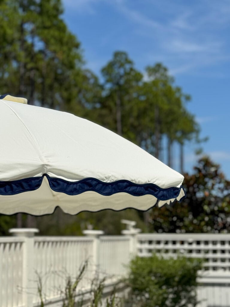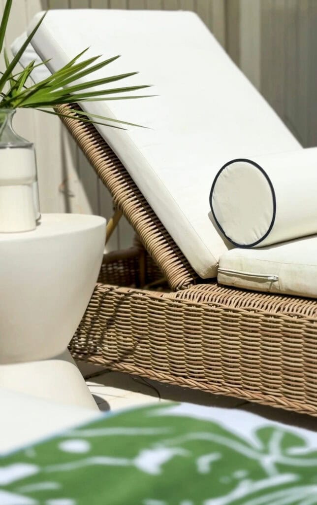 SOURCES: Umbrella | Scalloped Umbrella Stand | Outdoor Chaise Lounge Chairs | Lumbar Pillow | Side Table | Fig Print Towels