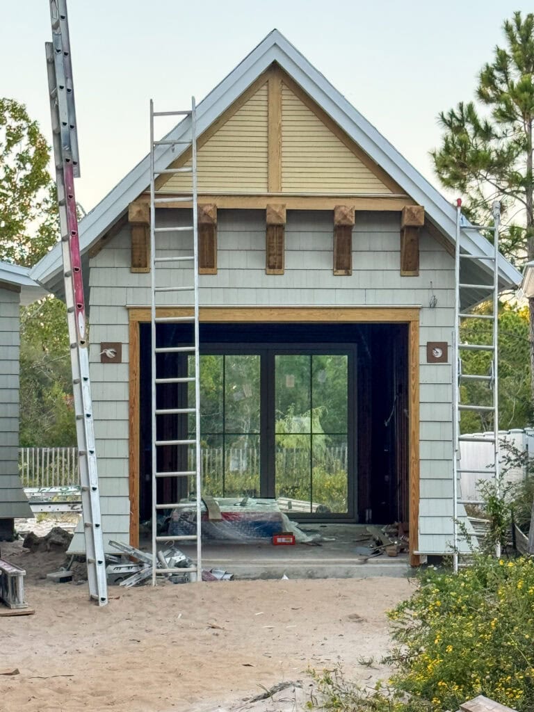 There was a lot more progress over at the house! How cute is Kurtis’ little workout gym/garage now that more of the trimwork has gone up?! We obviously don’t have garage doors yet in the front of the garages. So here you get to see all the way through. It’s not a super big space but he’s already got plans for a great layout that maximizes the layout.