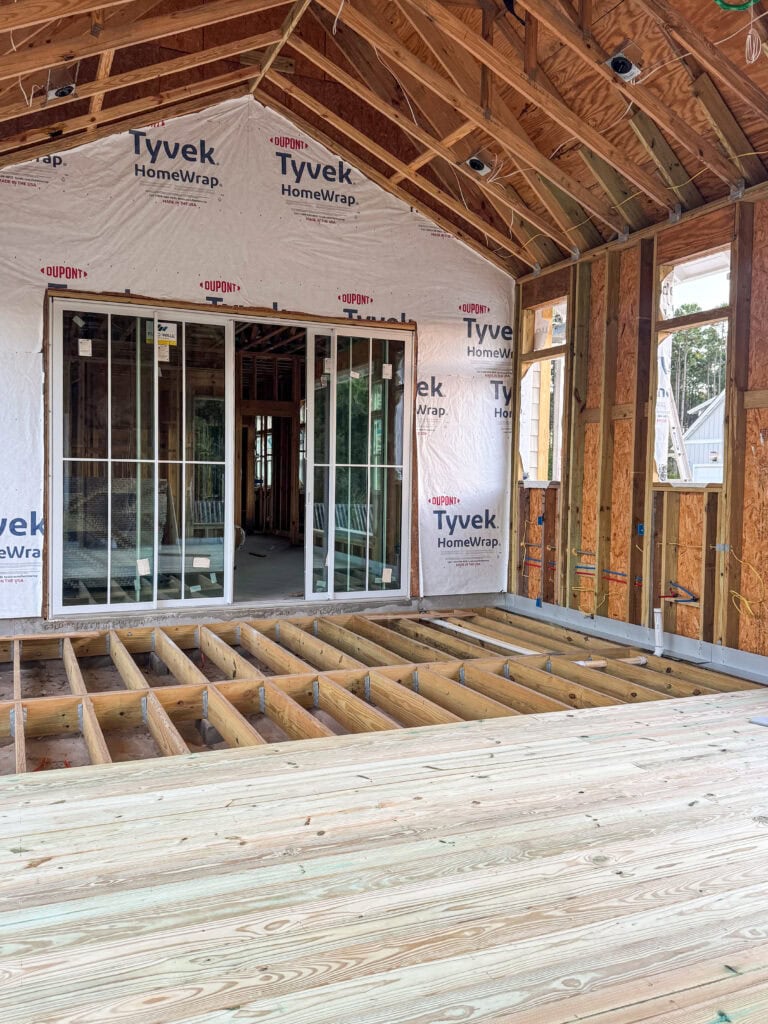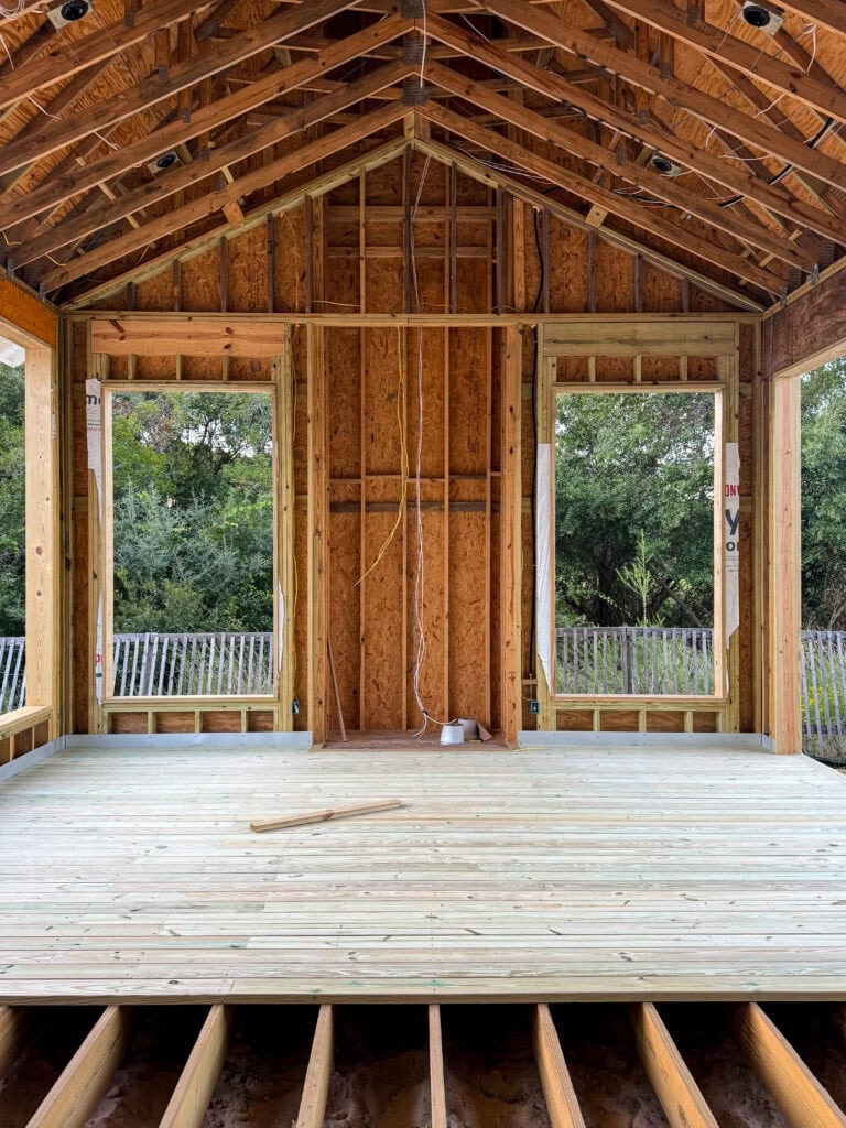 We didn’t get to stop by much during the week because we were busy playing catch-up on work, but over the weekend, they started laying our covered porch flooring which was really exciting! We could finally stand out there and check out all the site lines at the proper height!