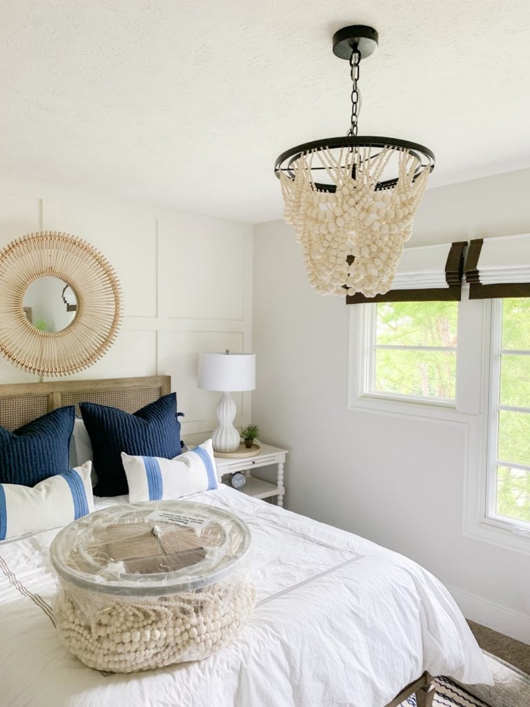 I’ve been scheming up some simple changes for our smaller guest bedroom for some time now. I’m trying to make it feel a bit more mature and cohesive. So often it’s the room that gets cast off decor from other rooms or from other seasons. I actually don’t think I’ve even shown this room on the blog since the first of the year which is a bit crazy (and not intentional). But, I started with my progress yesterday when I convinced Kurtis to hang the larger version of the bead chandelier we already have in the room. I’ve always loved the smaller one in here, but it only took one 40 watt bulb (my fault for not reading more closely) so we knew as the shorter days neared, we’d have to make a change. When the larger version was on crazy sale during Premier Day a week or two back, I decided to order it since I knew I already loved the overall vibe!