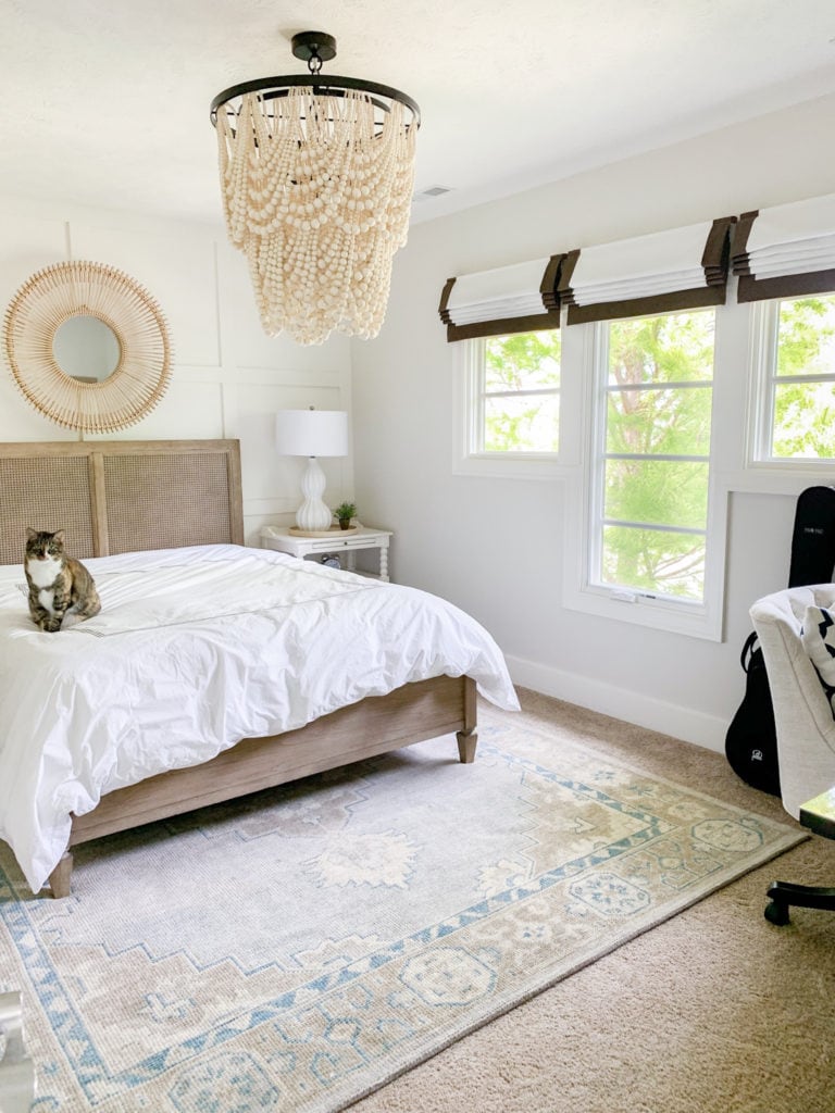 SOURCES: Cane Wood Bed | Rug | Bead Chandelier | Bamboo Mirror | Nightstand | Linen Desk Chair | Similar Roman Shades | Lamp – Lowe’s (old)