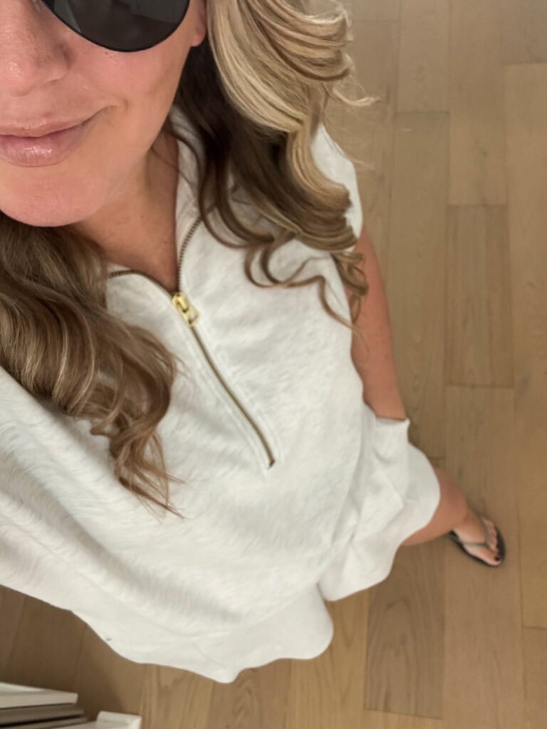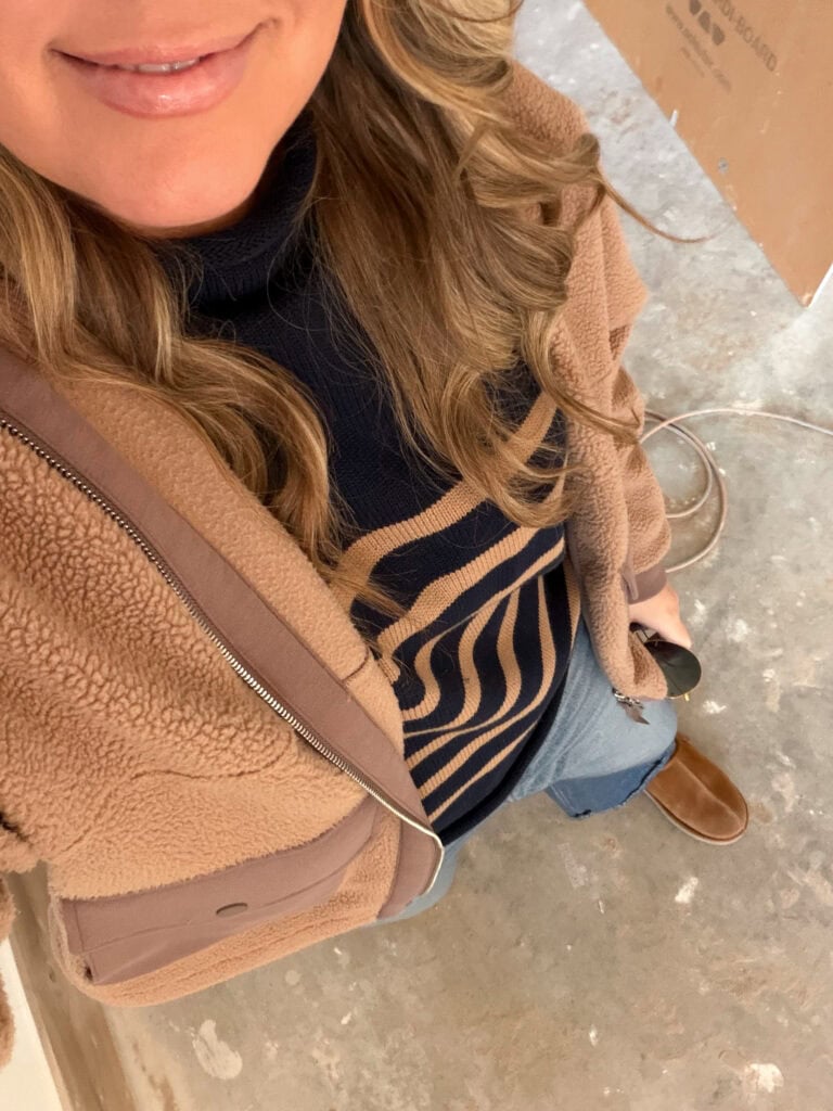 SOURCES: Top | Shorts | Flip Flops | Sherpa Jacket | Striped Sweater (Nordstrom Anniversary Sale purchase) | Sweatpant Jeans | Shearling Clog Slippers
