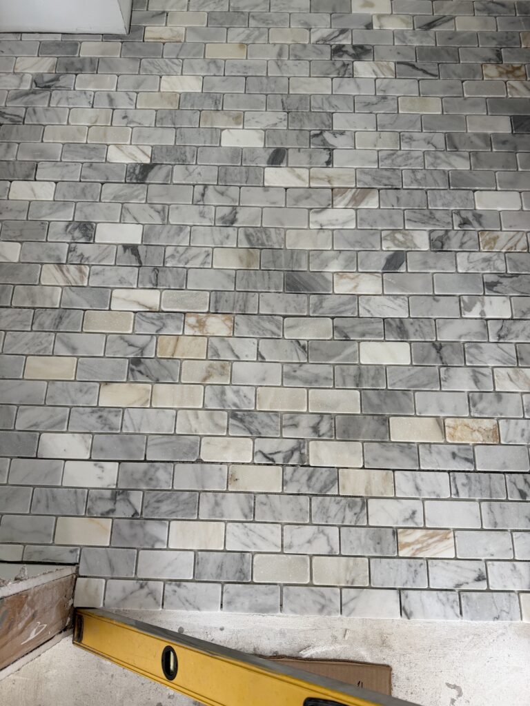 The only major issue is the bathroom floor in the space attached to my future office. We stopped over yesterday and to check progress and hated how this looked. This was supposed to be tumbled Carrara subways and it honestly felt like we were given the boxes with all the rejected sheets someone else returned. There was so much orange and super dark gray and then ultra white pieces. It looked absolutely nothing like the samples at the store or on the manufacturer’s website. I’ve reached out to the tile store to see what our options are. I’ve also asked the installer to not grout it to see if we can salvage this by even pulling out the really offensive pieces. I’ll keep you posted! I’m hoping it just hadn’t fully dried and maybe today it will look better, but it seems there are way too many high-contrast pieces for this to look correct.