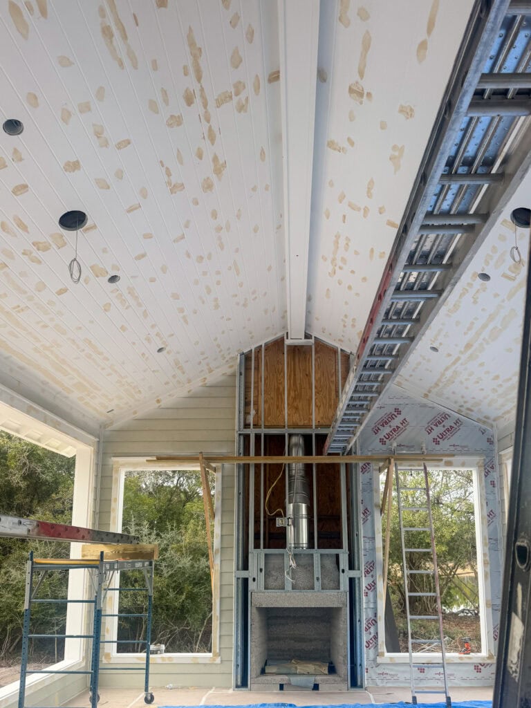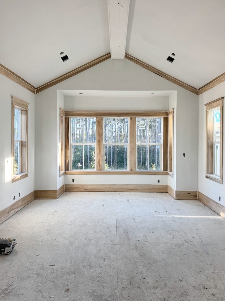 All of our closet systems have been built out, all trim has been installed (other than around doorways), and the beams have been built in our bedroom, bathroom and guest bedroom. They’ve also wrapped up filling, caulking, and sanding all of these trim details so it’s ready to be primed!