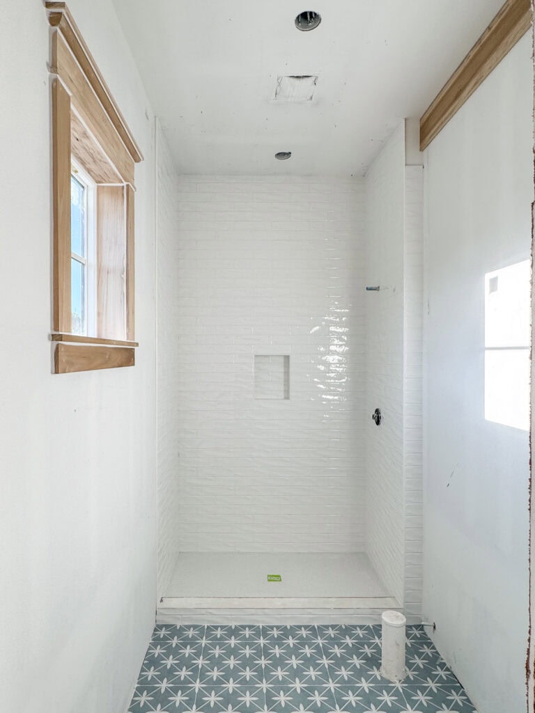 The most exciting stage we’ve entered is the tiling stage! The bathroom below is the most complete at this point. We’ve run into a few challenges with tile not properly being ordered at the tile store so a few spaces were short (like this room as well as our shower). You can see the curb and then the upper right corner still need a few more pieces. But it feels fairly complete otherwise and it’s fun to see it all coming together!