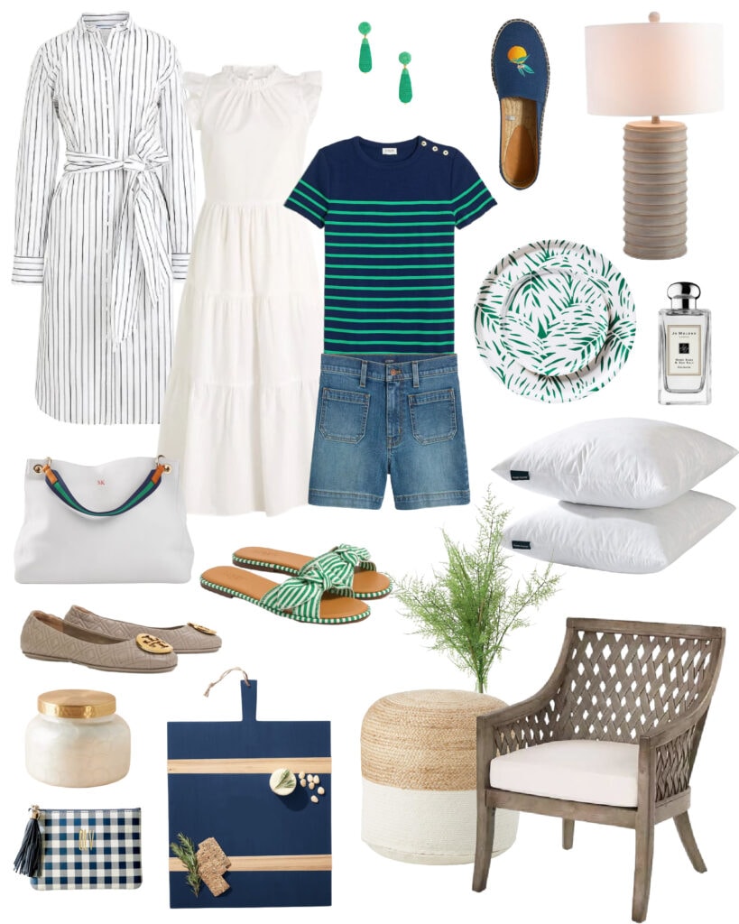 Cotton Poplin Shirtdress | Tiered Ruffle Sleeve Dress | Short Sleeve Button Neck Tee | High Rise Denim Shorts with Patch Pockets | Woven Teardrop Statement Earrings | Jo Malone Cologne | White Handbag | TB Quilted Ballet Flat | Embroidered Orange Espadrilles | Striped Knot Slide Sandals | Pair of Table Lamps | Round Laminated Palm Trays | Pair of Pillow Inserts | Real Touch Faux Asparagus Fern | Gingham Leather Zipper Pouch | Capri Blue Capiz Candle | Oversized Wood Cheese Board | Colorblock Jute Pouf | Woven Accent Chair