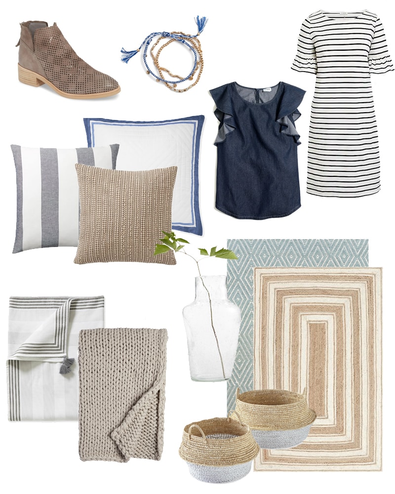 Perforated Booties | Bracelet Set | Striped Dress | Ruffle Denim Shirt |  Chunky Knit Throw | Tassel Beach Towel | Vase | Striped Pillow Cover | Blue and White Euro Sham | Honeycomb Pillow Cover | Set of Baskets | Indoor/Outdoor Diamond Rug | Neutral Striped Rug