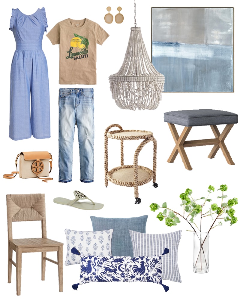 Jumpsuit | Limoncello T-Shirt | Vintage Wash Jeans | Drop Earrings | Crossbody Handbag | Tory Burch Miller Sandals | Abstract Art | Beaded Chandelier | Bench | Rope Bar Cart | Dining Chair | Linen Pillow Cover | Striped Pillow | Block Print Pillow | Otomi Print Lumbar Pillow | Viburnum Greenery | Vase