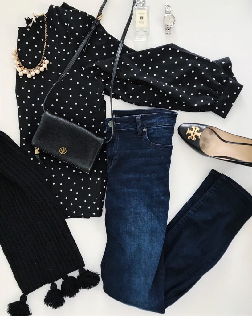 Polka Dot Blouse (50% off) | Favorite Skinny Jeans (33% off) | Pearl Necklace (50% off) | Black Wedges (similar) | Jo Malone Perfume | Watch | Black Leather Crossbody Bag (similar) | Scarf (similar)