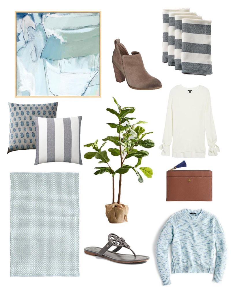 Art (20% off with code NEWYEAR)| Booties (50% off) | Striped Napkins (20% off with code NEWYEAR) | Block Print Pillow (20% off with code NEWYEAR) | Striped Pillow (44% off) | Tie-Sleeve Sweater (40% off) | Faux Fig Tree (20% off with code NEWYEAR) | Rug (20% off) | Clutch (25% off with code GOTIME) | Sandals (25% off) | Blue Sweater (25% off with code GOTIME)