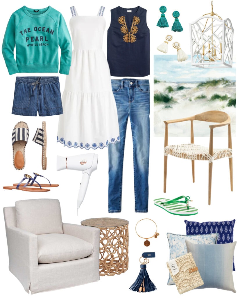 SOURCES: Ocean Pearl Sweatshirt | Striped Shorts | Espadrille Slide Sandals | Mini Miller Leather Sandals | Embroidered Scalloped Tiered Dress | Embroidered Bib Sleeveless Top | High-Waisted Jeggings | Beaded Tassel Earrings (both colors) | ‘White Sands’ Wrapped Canvas Art | White & Gold Lantern Pendant Light | Teak Accent Chair | T3 Hair Dryer | Charging Tassel Keychain | Charm Bracelet | Linen Swivel Armchair | Rattan Side Table | Kate Spade Striped Flip Flops | Block Print Pillow | Floral Pillow Cover | Ombré Stripe Pillow | Raffia Passport Cover