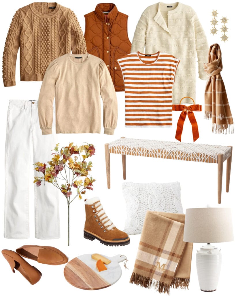 SOURCES: Button-back Cableknit Sweater | Cozy Puff-Sleeve Pullover | Drop-Shoulder Tee in Stripe | Quilted Vest | Collarless Sweater-Blazer with Fringe | Star Drop Earrings | Windowpane Blanket Scarf | White Bootcut Jeans | Velvet Hair Tie | Shearling Boots | Leather Loafers | Chunky Knit Throw Pillow | Plaid Throw Blanket | Marble & Wood Serving Board | Faux Autumn Oak Branch | Ceramic Table Lamp | Leather Weave Bench