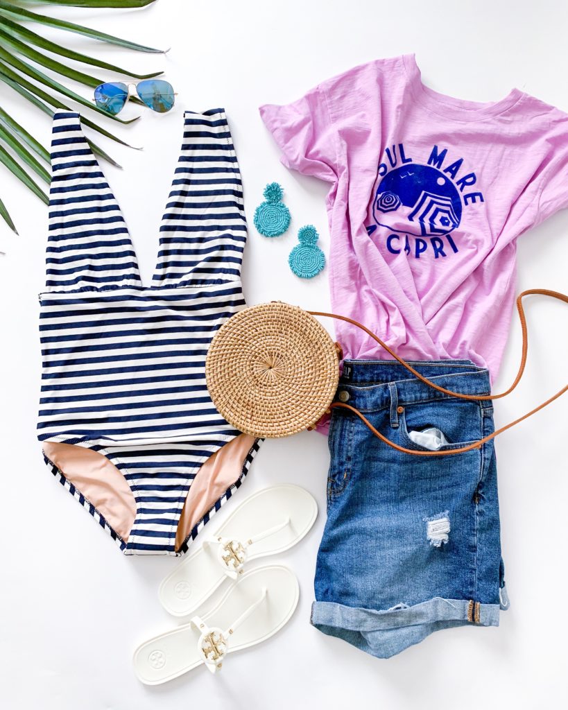 Bathing Suit | T Shirt | Shorts | Straw Bag | Sandals | Earrings | Sunglasses