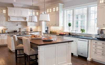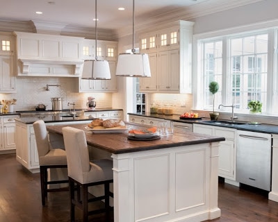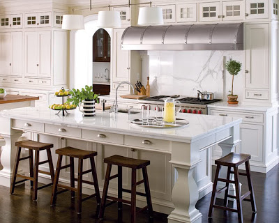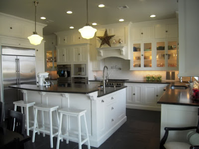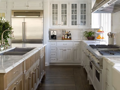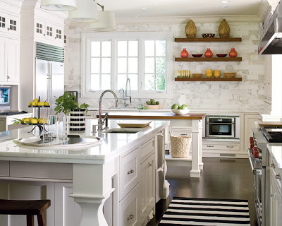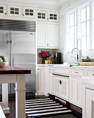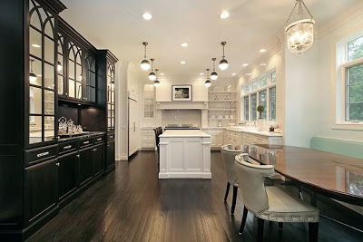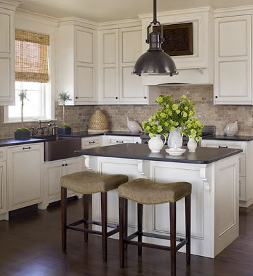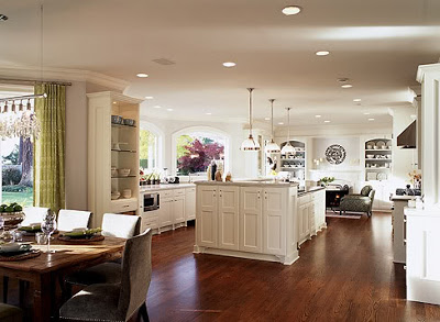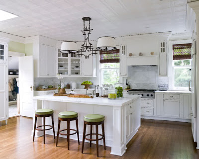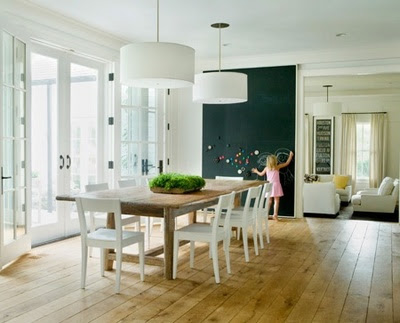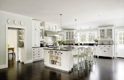 I have long wanted walnut colored hardwood floors throughout our main living area {but quickly changed my mind when I realized what it would cost}. I love nothing more than dark hardwood floors with crisp, white kitchens and cabinetry {and small amounts of beadboard}. I find I am really drawn to those settings where there is small doses of lime green {in the plants, fruit, topiaries, etc. in the room}.