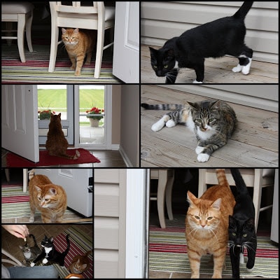 Last but not least, a few new pics of our kids playing this weekend. They LOVE to go outside. Bearcat begs at the front door but today he was content just looking out and watching the robins. Notice the three beggars – Bailey never wants human food but the other three drive us crazy. One of my favorites is of the two boys ~ it is so classic ~ Hawkeye always runs to catch up to the others so he can rub all over them (notice how close they are). So cute!